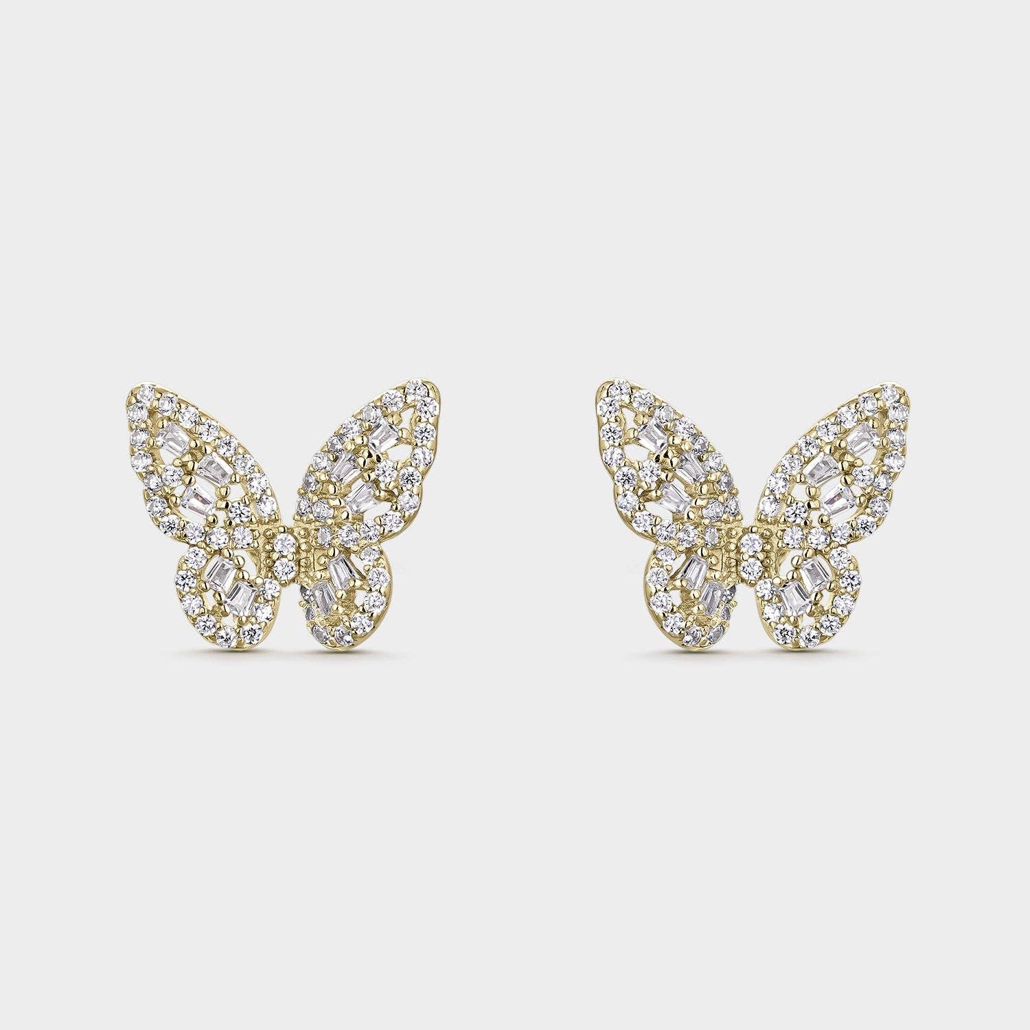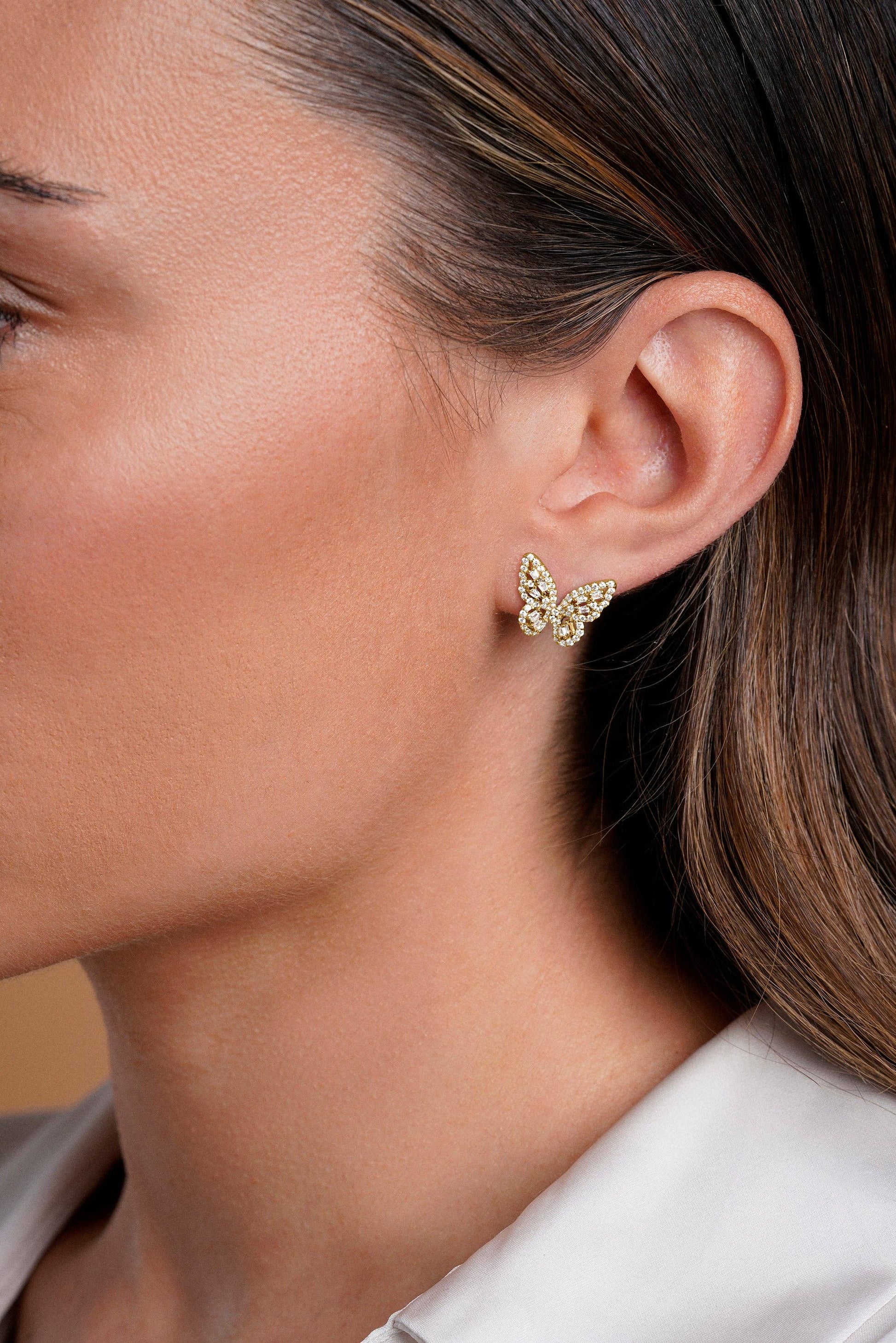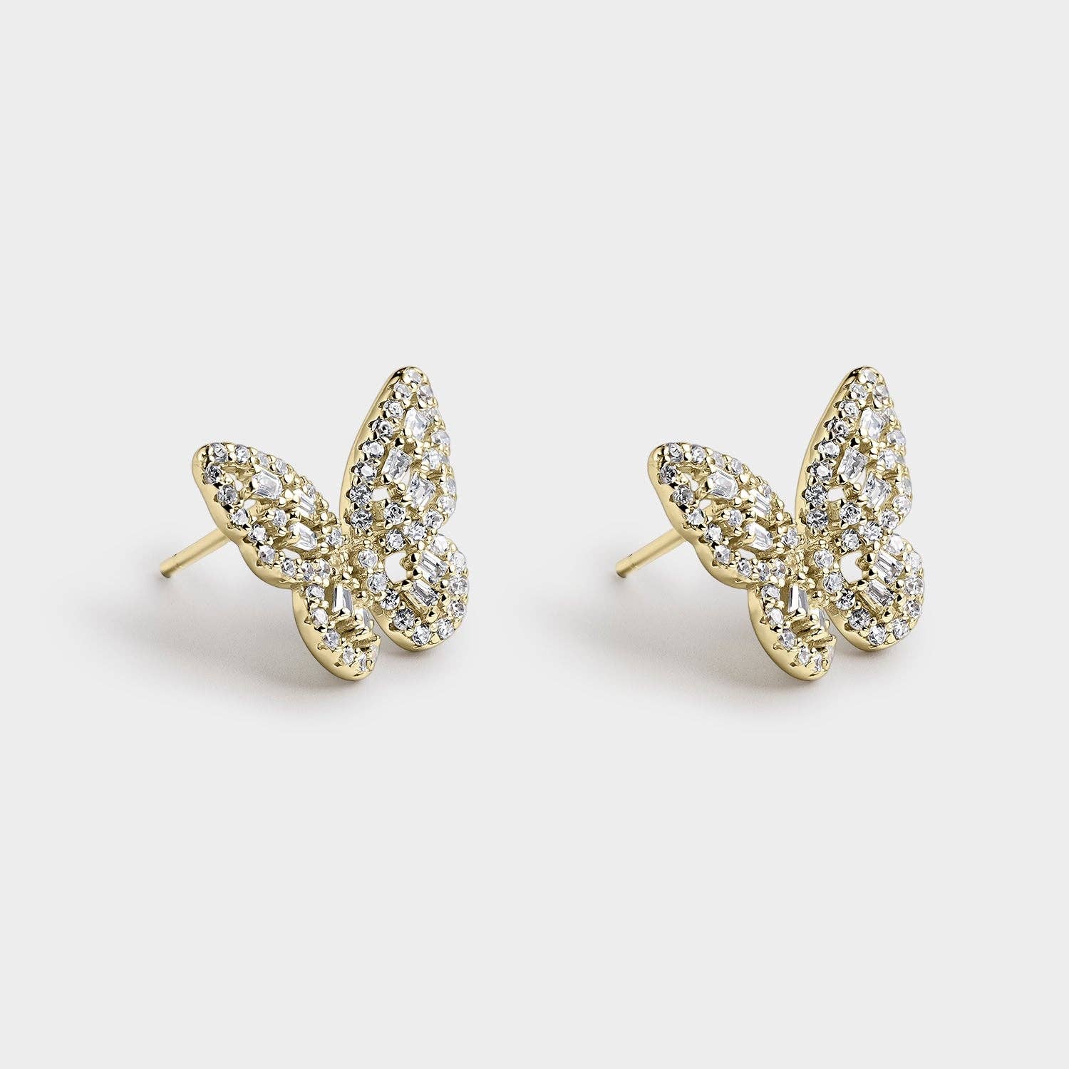 Boucles d’oreilles papillon en argent 925 plaqué or jaune. Les ailes délicatement pavées de pierres apportent une belle lumière au visage. Un design raffiné, imaginé et confectionné par une joaillerie madrilène.